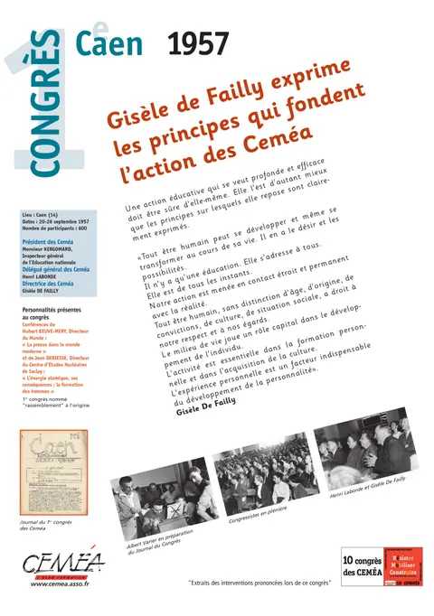 Du 20 au 26 septembre 1957 se réunissaient à Caen, 600 congressistes pour le 1er Congrès de l'histoire des Ceméa, nommé "rassemblement" à l'origine. Gisèle de Failly co-fondatrice, y exprime les principes qui fondent l’action des Ceméa.