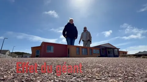 Module Le Géant : un personnage se tenant debout derrière un bâtiment, saute par-dessus et se retrouve au premier plan.
